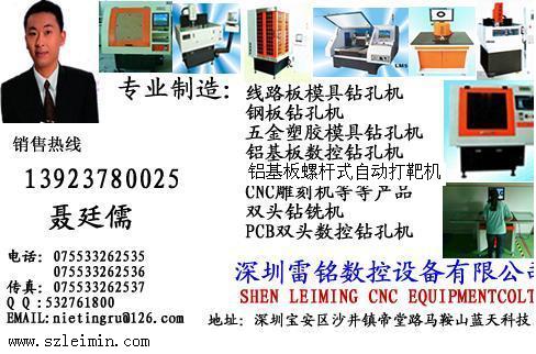 深圳雷铭数控设备有限公司是一家集研发,设计,生产经营为一体的高新科技企业,以市场为导向,致力于数控机床的研制开发。主要产品线路板模具钻孔机,五金模具钻孔机,塑胶模具钻孔机,钢板钻孔机,PCB数控钻孔机,铝基板双头数控钻孔机、双头钻铣床,自动打靶机、雕刻机、数控v割机等多种数控产品。秉承传统机床的生产工艺,融入现代机床设计理念,尽力于解决客户在使用过程中的实际问题,技术已达国内同行业的先进水平。深受客户的信赖和赞扬!